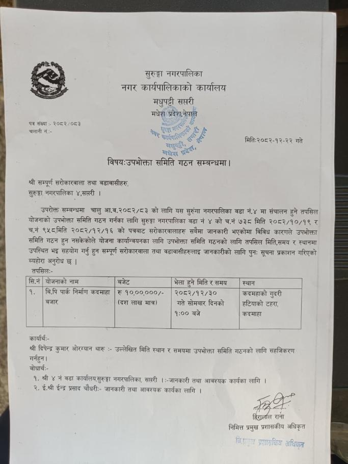 सुरुङ्गा नगरपालिकाको उपभोक्ता समिति गठन,परिचालन तथा व्यवस्थापन सम्बन्धी कार्यविधि २०७८