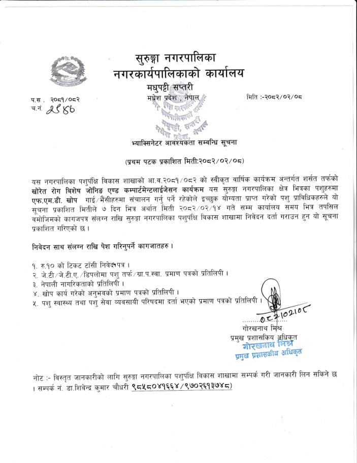 भ्याक्सिनेटर आवश्यकता सम्बन्धी सुचना |