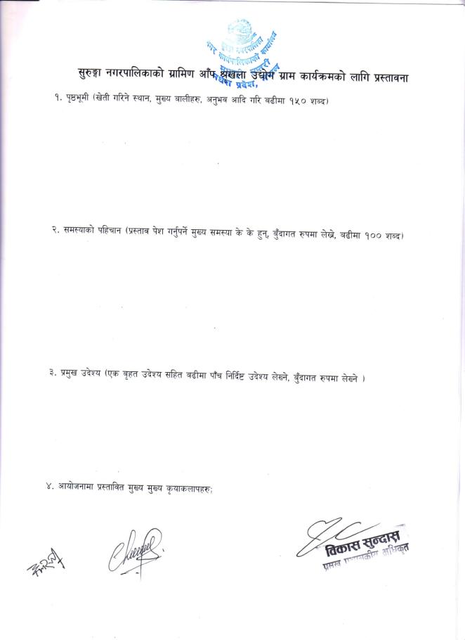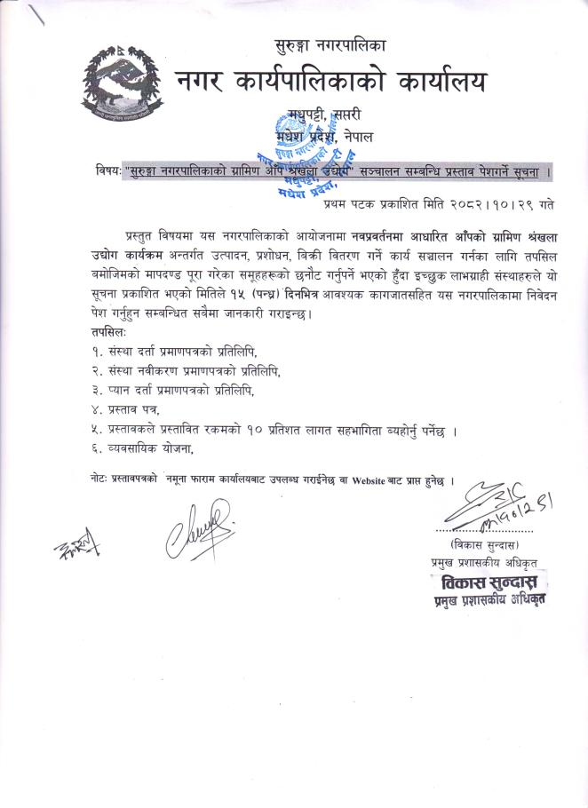 सुरुङ्गा नगरपालिकाको ग्रामीण आप शृंखला उद्योग संचालन सम्बन्धी प्रस्ताव पेश गर्ने सुचना |