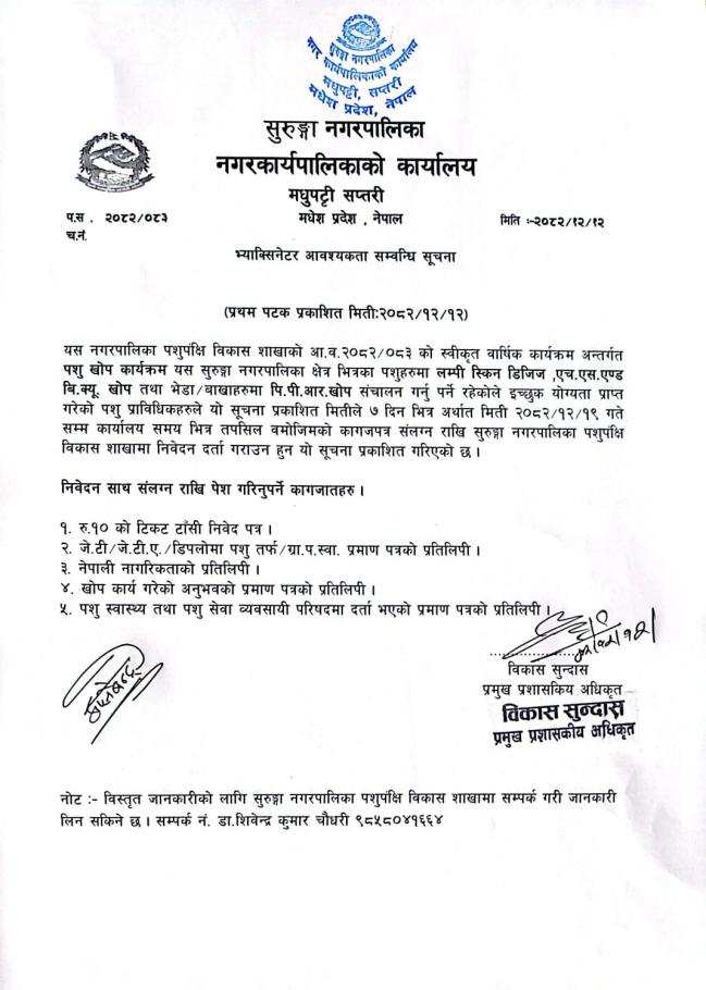 भ्याक्सिनेटर आवश्यकता सम्बन्धी सुचना |