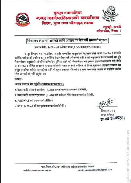 विद्यालय लेखापरीक्षणको लागि आसय पत्र पेश गर्ने सूचना ।